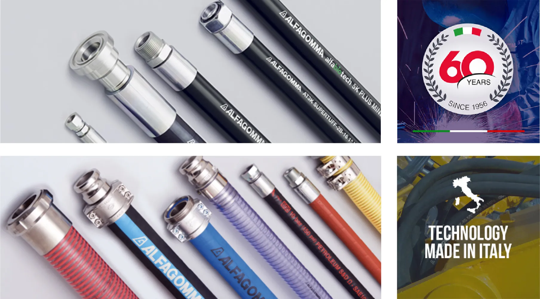 Since 1956 Alfagomma has been manufacturing and delivering top quality products all over the world. Alfagomma believes in the importance of offering an excellent service to all its customers along with a continuous new product research and development, a technical innovation and customized solutions, a constant high quality exceeding ISO 9001 quality standards and full compliance with ISO 14001 environmental norms, a global presence and logistic support, a strong OEM expertise and customized solutions.
